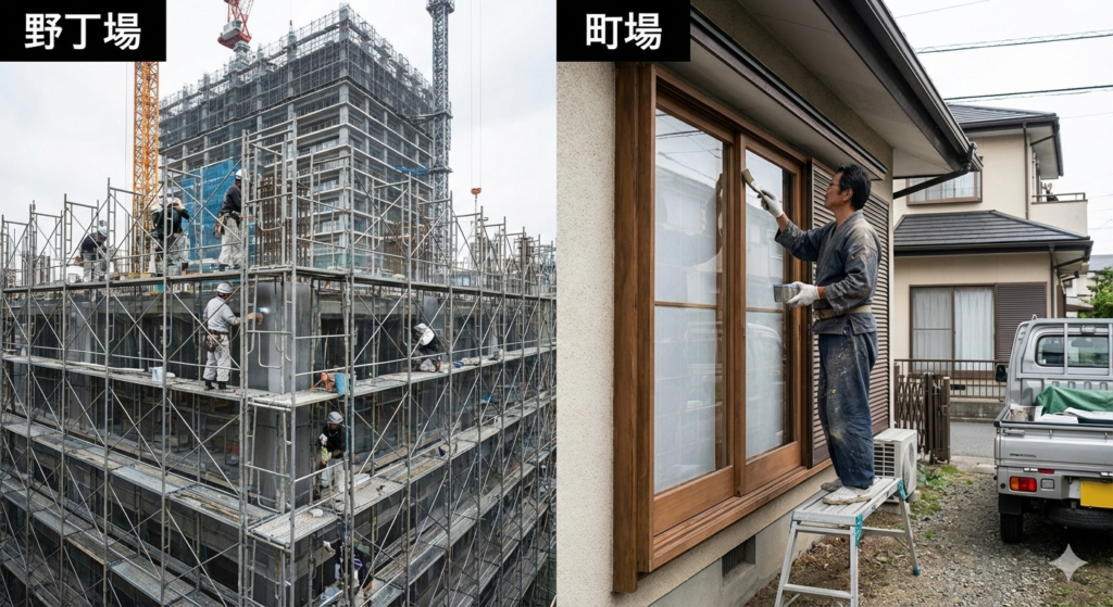 一口に塗装工と言っても大きく分けると野丁場の塗装工と町場の塗装工に分けることが出来ます。一見しただけでは見分けが付きませんが、同じ塗装でも求められるものが違います。まずはその違いを紹介しましょう。
